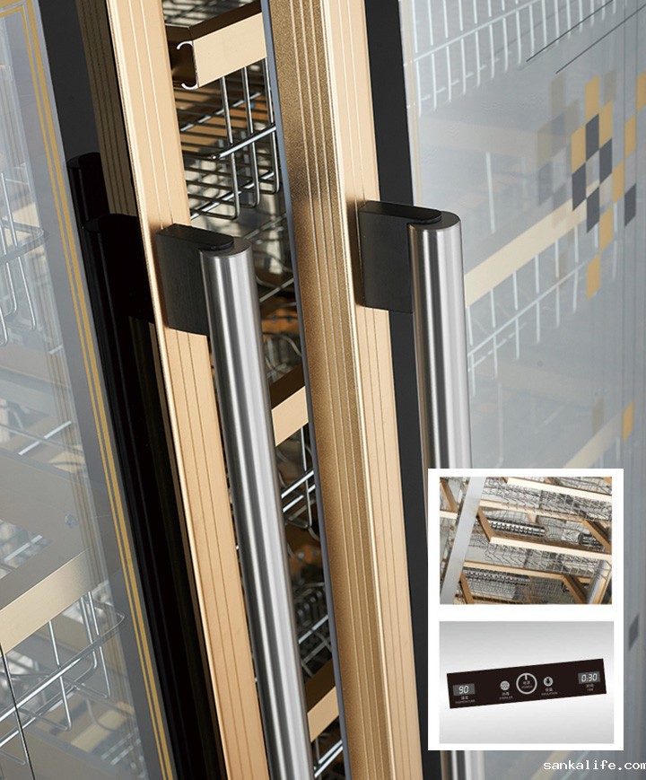 电脑控制触摸屏,光波高温消毒;可透视玻璃门,整体发泡保温;豪华不锈钢把手,铝合金推拉式导轨;特设超高温保护功能。